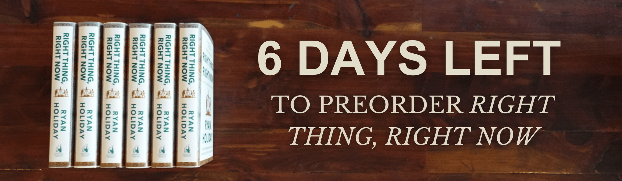 | They can break the rules. They can bury you in paperwork. They can lie. They can abuse their power. They can hurt people. They can do all this impunity. It's not just that they can. It's that they almost certainly will. Injustice is not an aberration in this world, it's practically the norm. Anyone who has tried to bring about change, who has tried to do the right thing, who has tried to follow virtue to its natural conclusions has found this out. But you know what they can't do? They can't make you be like them. This is what Marcus Aurelius reminds himself at the beginning of Meditations. "No one can implicate me in ugliness," he writes. Later in Meditations he observes that he can never truly be harmed by an outside force because outside forces have no sway over his soul, over his character. Yes, the powers that be can stymie us but they can't force us to like them…or be like them. That's a choice we make. That's something that's in our power. That's something that we can and must resist. They're going to do what they're going to do—cheat, abuse, hurt, act with injustice—but we're not. We're going to stay at it. We're going to keep going back (as we talked about). We're going to be and do good. That's the aim of Ryan Holiday's newest book Right Thing, Right Now: Good Values. Good Character. Good Deeds… Right Thing, Right Now is a roadmap to help you become more tolerant, more forgiving, more generous. To help you find the strength to protect yourself against outside forces and stand by your convictions. To help you toughen yourself against the ugliness and deceit of others. To help you raise better children and be more giving to your friends, family, and community. Because we want to encourage you to preorder the book, we put together some exciting bonuses for you, like a signed, numbered page from the original manuscript (full of Ryan's handwritten edits!) and a welcome video from Ryan where he discusses how working on the book strengthened his own convictions. We also worked with the publisher on an initial run of numbered, signed copies available while supplies last (pictured above!). Plus, we have unsigned copies cheaper than Amazon. Head here to learn more about these bonuses and how to receive them TODAY! *** |